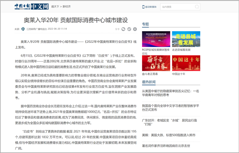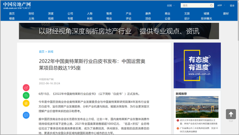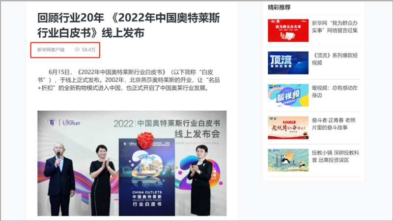 會后,國內(nèi)主流權(quán)威媒體紛紛在第一時間通過各自官方平臺及渠道發(fā)布此次活動盛況及內(nèi)容。截止6月23日,共計近百家媒體在全網(wǎng)發(fā)布、轉(zhuǎn)載“2022年中國奧特萊斯行業(yè)白皮書線上發(fā)布”相關(guān)報道及新聞百余次,全網(wǎng)累積點擊閱讀量近五百萬次。