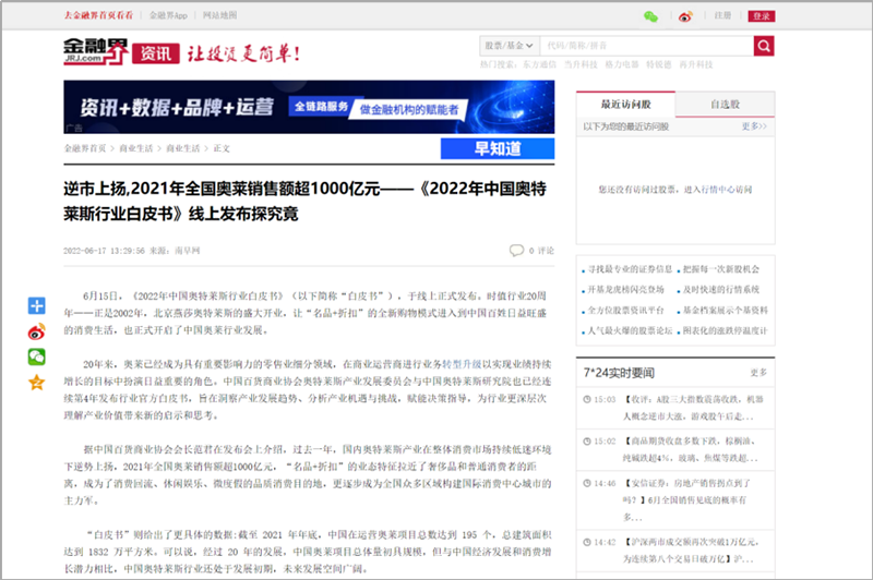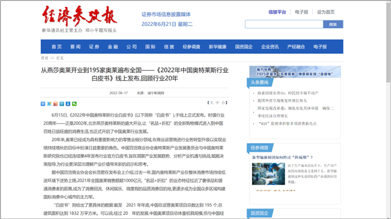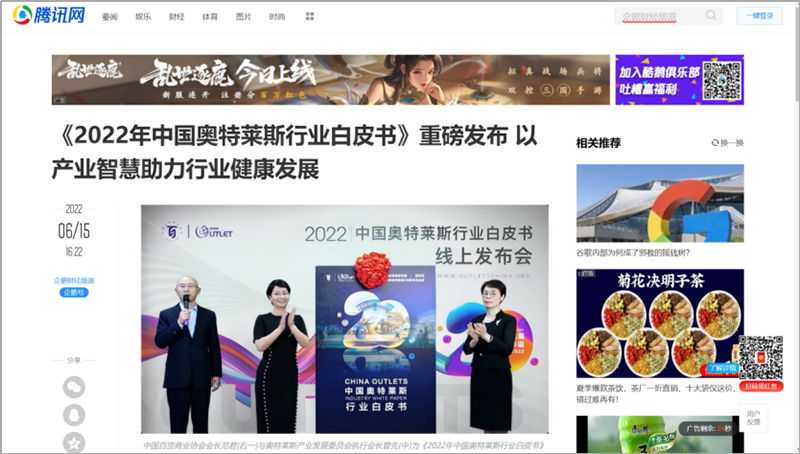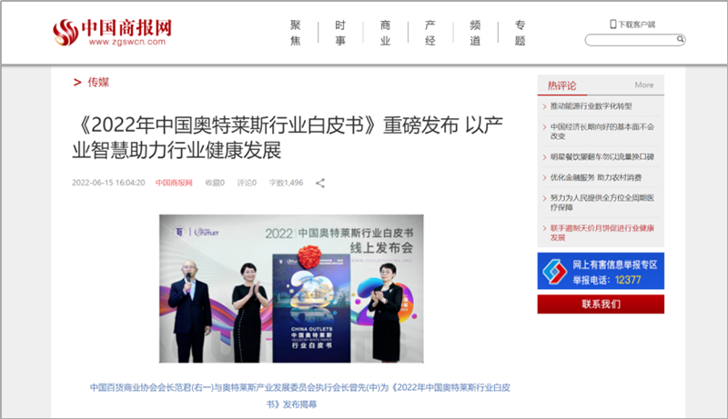 2022年6月15日,中國百貨商業(yè)協(xié)會奧特萊斯產(chǎn)業(yè)發(fā)展委員會線上直播發(fā)布《2022年中國奧特萊斯行業(yè)白皮書》。白皮書中“2021年中國零售市場最新發(fā)展、中國奧萊20年全覽、2021年中國奧萊市場發(fā)展、中國奧萊展望和政策建議、專家訪談”等內(nèi)容吸引政府領(lǐng)導(dǎo)、專業(yè)機(jī)構(gòu)、產(chǎn)業(yè)運營商、品牌商、服務(wù)商、媒體記者及眾多奧萊消費者共計20余萬人參會,成為國內(nèi)奧萊行業(yè)年度一大焦點。