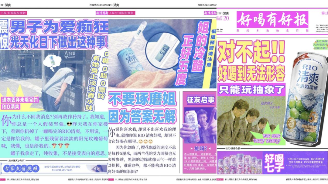除此以外,RIO微醺化身成戲精上線的「好喝有好報(bào)」主題活動(dòng),在畫(huà)風(fēng)設(shè)計(jì)、產(chǎn)品口味描述與故事性上整花活兒,做到了內(nèi)容有料有梗,實(shí)現(xiàn)了用戶與品牌玩在一起。