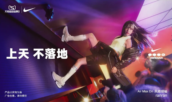 提及“發(fā)瘋”,耐克的「上天不落地」?fàn)I銷大事件也是不得不提一提的。借助新發(fā)布系列的契機(jī),耐克與天貓超級(jí)品牌日牽手,通過(guò)與潮流人群共創(chuàng),借助城市文化加強(qiáng)對(duì)潮流藝術(shù)的表達(dá),深度溝通年輕人群,在社交平臺(tái)上號(hào)召網(wǎng)友們玩轉(zhuǎn)“先瘋”穿搭共創(chuàng)。
