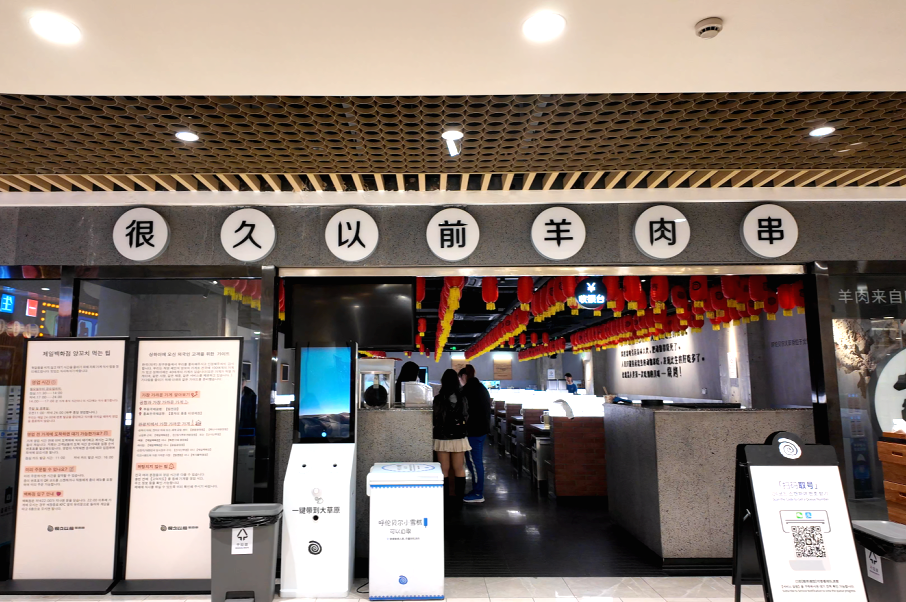 值得一提的是,在國(guó)家開(kāi)放免簽政策,韓國(guó)旅客接踵而至,其統(tǒng)一的打卡模式直接帶火了“很久以前羊肉串”,尚未到正式的用餐時(shí)間,該門店前已開(kāi)始排隊(duì),其中大部分等位人員為韓國(guó)游客。他們除了可以在店員的輔助下使用烤爐現(xiàn)烤現(xiàn)吃,還將門店附贈(zèng)的“冰涼貼”作為了打卡的必備項(xiàng)目。
