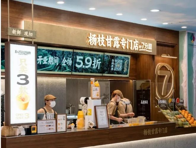 去年,七分甜的首家楊枝甘露專門店在上海長(zhǎng)寧龍之夢(mèng)開(kāi)業(yè),在產(chǎn)品方面,專門店僅售三款產(chǎn)品,分別是1987經(jīng)典楊枝甘露、2007鮮芒楊枝甘露、楊枝甘露Gelato,分為碗裝、杯裝和冰淇淋,定價(jià)在15-20元。在店型方面,走小店模式,不設(shè)堂食。專門店面積大約只有20平方米左右,目前僅支持下單后排隊(duì)自取。在裝修風(fēng)格上,店內(nèi)裝修以原木配色為主,主打簡(jiǎn)約風(fēng)。在鮮果陳列區(qū)擺放了制作楊枝甘露所需要的椰子、芒果、西柚等原料,采用明檔吧臺(tái)在顧客面前現(xiàn)切現(xiàn)做,讓消費(fèi)者直觀感受產(chǎn)品的制作流程。